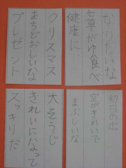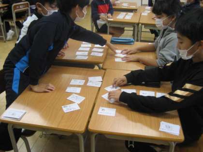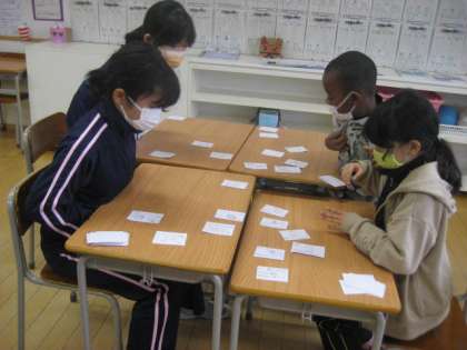 4年生の国語科の「冬の楽しみ」の学習では、季節の言葉を使って、冬の楽しさを伝えるカルタを作りました。手作りのカルタをみんなで楽しみました。