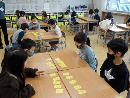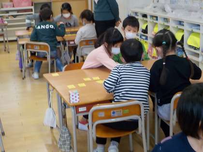 グループに分かれて、百人一首を行いました。「覚えたから、前よりもたくさん取れたよ。」「絶対に勝ちたいから、もっとたくさん覚えたい。」など意欲的に取り組む姿がみられました。