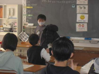 6年生の外国語科では、世界と自分のつながりを発見してALTに紹介しました。身近にある文房具や服、食べ物等、いろいろな物が外国で作られていることに気付き、学習したことを生かして発表しました。実物や写真を見せながら話すなど、ALTに分かりやすく伝えようと工夫する姿が見られました。