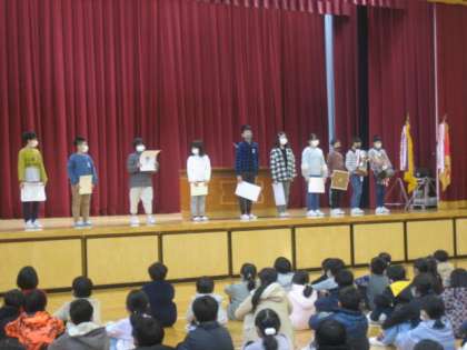 受賞伝達式を行いました。たくさんの子供たちが紹介されました。