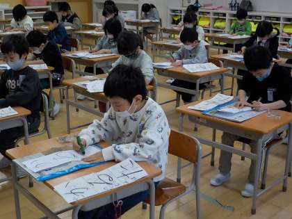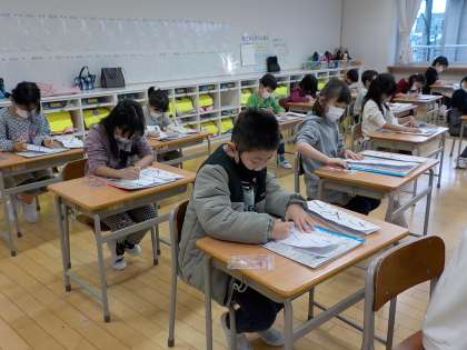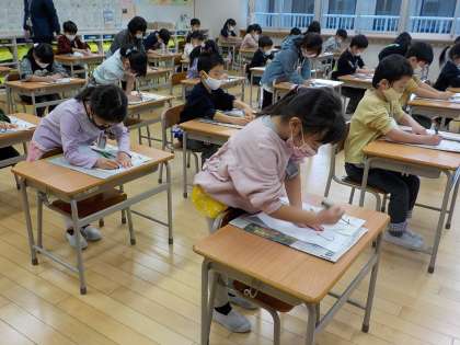 書き初め大会を行いました。お手本を見ながら集中して書きました。1年生の様子です。