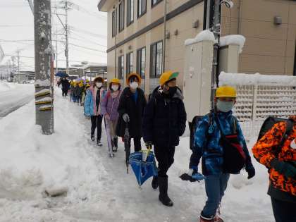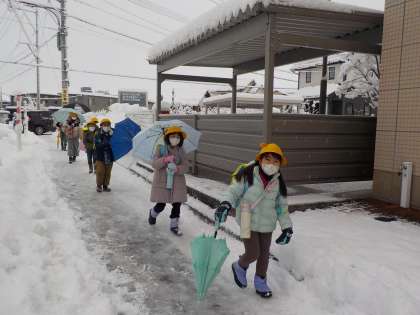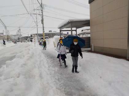 「おはよう。歩いてきたんだね」と声をかけると、「うん、がんばった」と元気に答えてくれました。雪国の子供はこうやって雪道の歩き方を体で覚え、たくましく成長します。