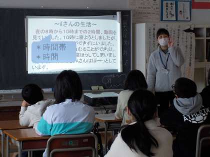 5、6年生を対象に、学校保健委員会を行いました。2学期末に行った生活アンケートの結果から、テレビ、ゲーム、スマートフォンなどの画面を見る時間が長く、生活リズムが崩れている実態が分かってきました。そこで、養護教諭から、画面を見る時間が長いと脳や心、体にどのような影響を及ぼすのか話してもらいました。どの子供たちも、自分ごととして真剣に話を聞き、自分の生活の仕方を見直していました。この後、画面を見る時間を決めて「元気いっぱい白鳥っ子大作戦!」に一週間取り組みます。メディアと上手に付き合い、明るく健康的に生活するよさを実感してほしいと思います。