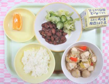 【献立】 ・ごはん ・牛乳 ・ちゃんこ鍋 ・煮豆 ・きざみ和え ・いよかん