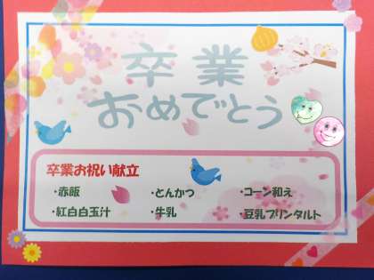 今日の給食は「おいわいこんだて」でした。調理員のみなさんが、6年生一人一人に卒業に向けたメッセージカードを作ってくださいました。