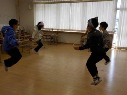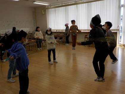 休み時間には縄跳びの練習をがんばっています。二重跳びができるようになった子が増えてきました。下の写真は、「先生、みんなでいっしょに跳ぶから見てください!」と輪になって跳んでいる様子です。あまりくっついて遊べない時期ですが、距離を取って友達と工夫して遊んでいます。