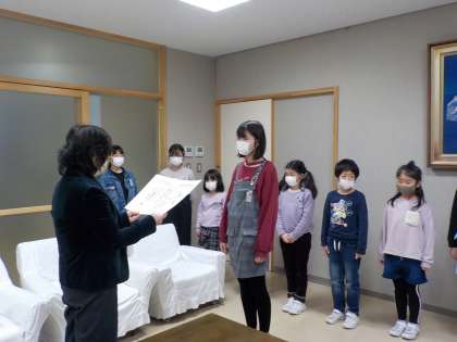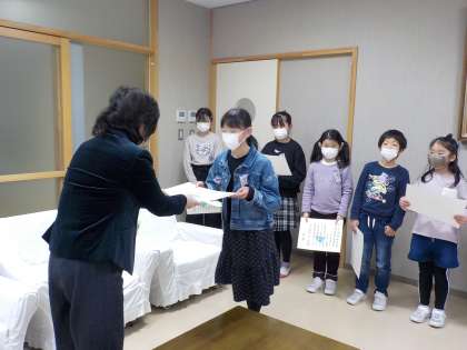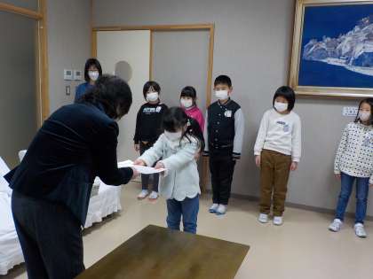 校長室で、県書初め大会や「わたしのママ・パパをかきましょう」図画コンクール等の授賞式を行いました。校長先生から賞状をうれしそうに受け取っていた姿が印象的でした。