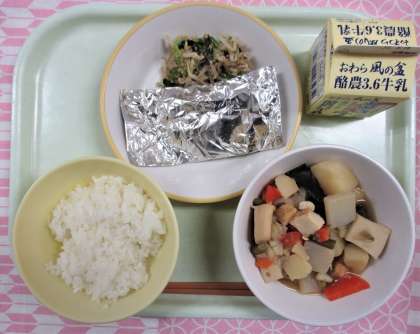 【献立】 ・ごはん ・牛乳 ・さばの銀紙焼き ・ごまびたし ・関東だき