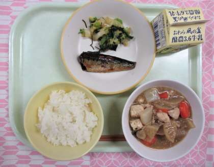 【献立】 ・ごはん ・牛乳 ・鶏肉と根菜のごま煮 ・いわしのしょうが味 ・昆布和え