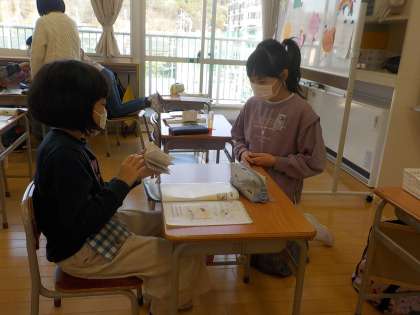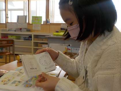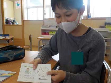 4年生の「This is my day.」の学習では、“I wake up at 6:30.”など、日課や時刻の表現を使って、ミニ絵本を作りました。自分の1日を伝え合い、お互いのことをより知ることができました。