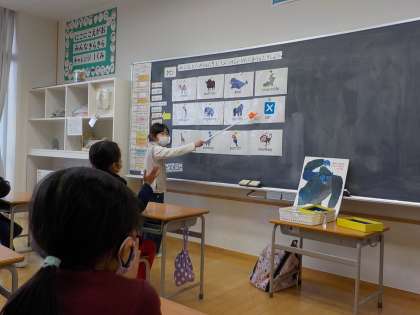 1、2年生では、外国語の体験授業を行いました。エリック・カールの“From Head to Toe”の読み聞かせをして、体の部分や動物の言い方を学習しました。絵本の話を聞きながら体を動かしたり、ゲームを通して、英語表現に親しんだりしました。