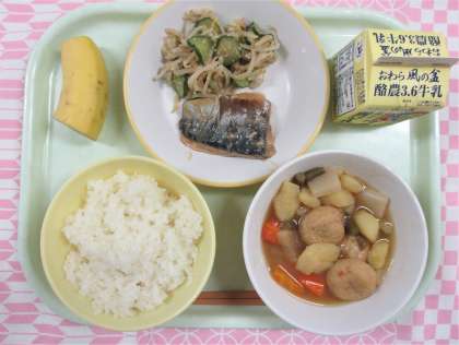 【献立】 ・ごはん ・牛乳 ・さばのみそ煮 ・ごま酢和え ・関東だき ・バナナ