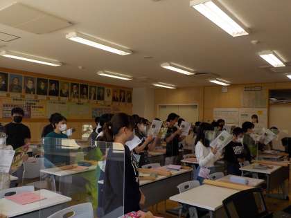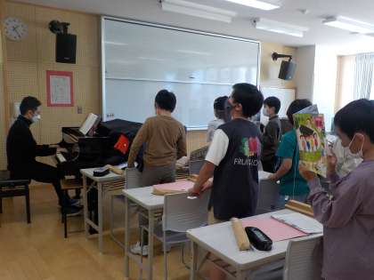 マスク着用や、十分な換気等の感染対策をとり、音楽室で学習しています。