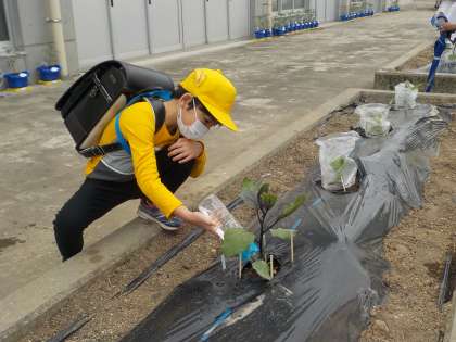 苗の様子を見ながら、やさしくやさしく水やりをしています。