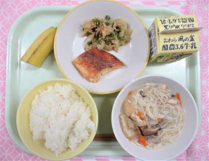 【献立】 ・ごはん ・牛乳 ・赤魚の塩焼き ・いり大豆和え ・にゅうめん ・バナナ