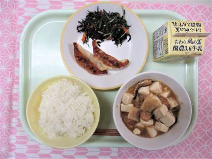 【献立】 ・ごはん ・牛乳 ・えびと豆腐のうま煮 ・焼きぎょうざ ・ひじきのごま和え