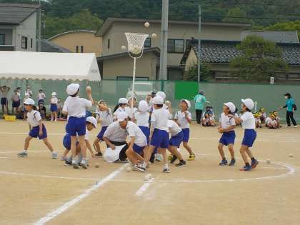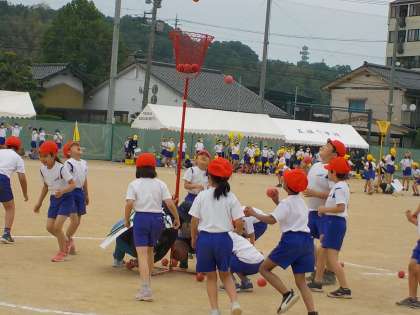 高いかごをめがけて、思い切って玉を投げていました。赤団、白団です。
