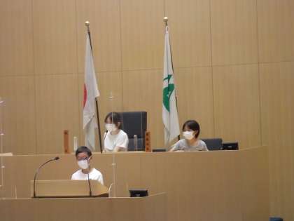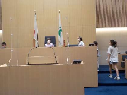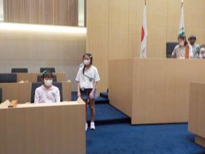 県議会の議場では、議長席や知事席に座ってみました。