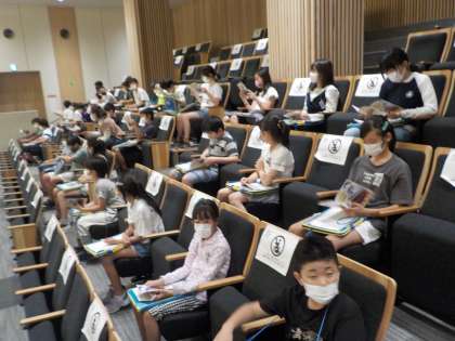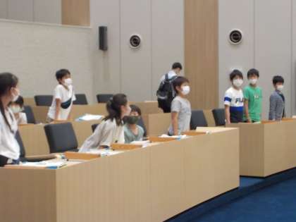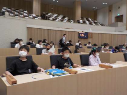 県議会の議場では、傍聴席や議員席に座ってみました。