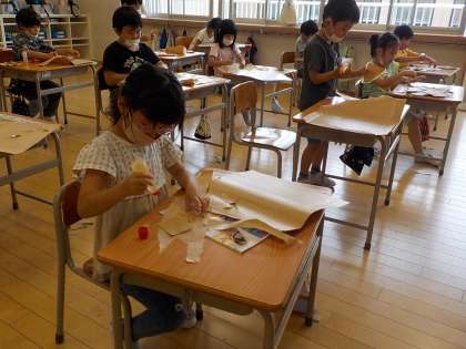 今日の図工の学習では、やぶいたり、ちぎったりした紙が、何に見えるか考えました。クレヨンで模様を書き加えたり、紙を繋いだりしながら、工夫して作品づくりに取り組みました。