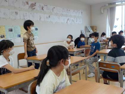 学級会「学級目標を振り返ろう〜勇気を出して積極的にチャレンジ〜」の様子です。