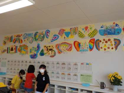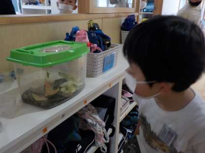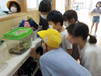 「今朝、家でバッタが脱皮したから持ってきたよ」と虫かごを見せてくれた3年生。友達が集まってきて、観察していました。(写真上・中)