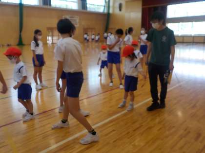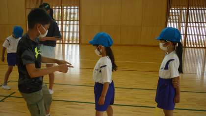 体育の時間に6年生さんに反復横跳びを教えてもらいました。「かにさんみたいに足を動かすんだよ」と分かりやすくポイントを教えてもらい、練習に取り組みました。