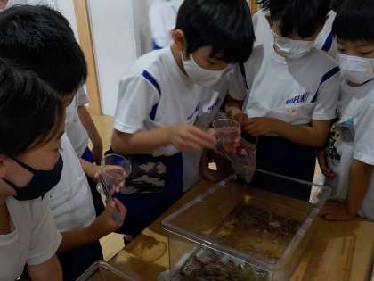 「わぁ、食べてる!」「こっちのサンショウウウオにもあげようよ」自分たちで小さな命を守ろうとする、頼もしい2年生です。