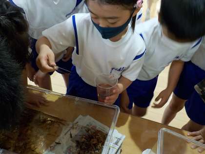 先週のうちに5年生から飼育の仕方を教わっていた2年生は、今日早速えさをやりました。