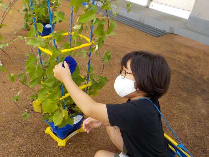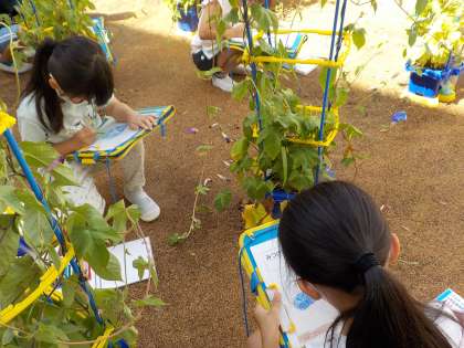 アサガオの花が咲き、嬉しそうな子供たちです。花の形や色を詳しく観察しました。