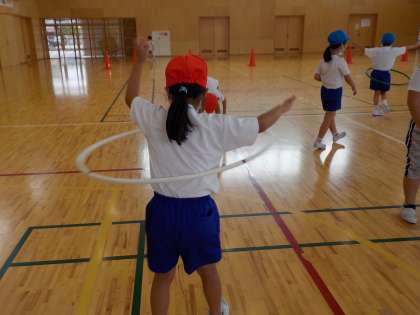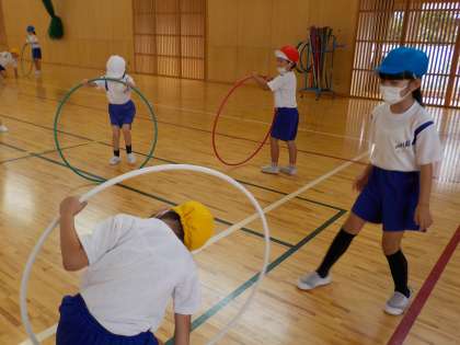 今日体育の時間に、フラフープを使って運動しました。フラフープの中をくぐったり、腰で回したりしながら楽しく活動することができました。