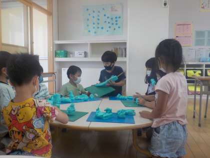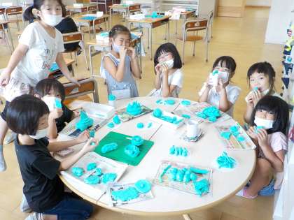 図工の時間に粘土でごちそうをつくりました。粘土を丸めたり、のばしたりしながら工夫してつくることができました。完成した作品を友達と見せ合って嬉しそうな子供たちでした。