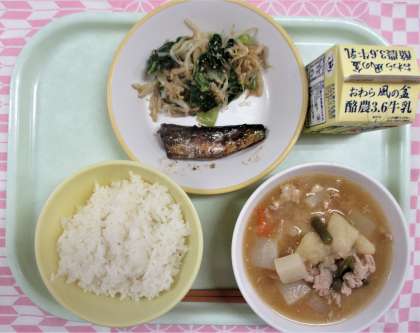 【献立】 ・ごはん ・牛乳 ・いわしの土佐煮 ・ごま和え ・豚肉とじゃがいもの南蛮煮