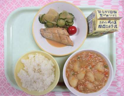 【献立】 ・ごはん ・牛乳 ・鰆の西京焼き ・華風和え ・ミニトマト ・野菜ふりかけ
