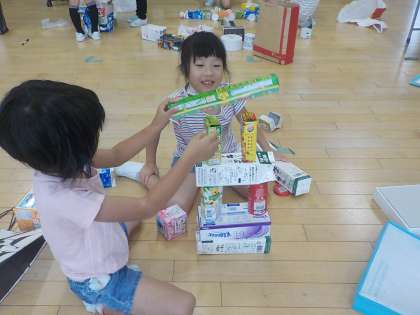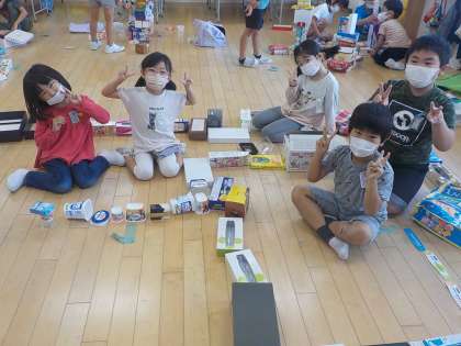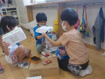 図画工作科の「いっぱいつかってなにしよう」の学習では、いろいろな箱を並べたり積んだりして、思いついたものをつくりました。友達とアイディアを出し合いながら、活動を楽しみました。