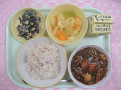 〜今日の給食 10月7日(金)〜 公開日 2022/10/07 更新日 2022/10/07 職員室より 【献立】 ・麦ごはん ・牛乳 ・たべキリンハヤシ ・大豆とひじきのサラダ ・フルーツゼリーミックス
