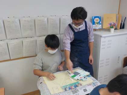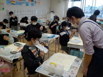 中学校の先生から色の塗り方について、立体感の出し方や塗る順番などを教えていただきました。