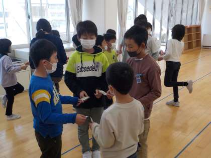 写真下:みんなでバランスチャレンジ(2年生と交流会)