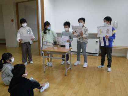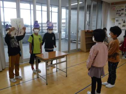 1年生に野菜のことを知ってもらおうと、野菜作りで学んだことを発表しました。クイズや劇、新聞等で、伝え方や内容を工夫し、1年生に分かりやすい発表を考え、伝えました。