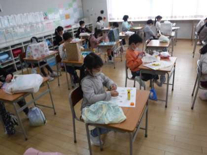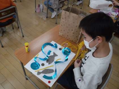 「このくるくるした紙は水色できらきらしているから波にしようかな」などと話しながら、自分のイメージしたものを表すのに真剣な子供たち。集中して作品をつくる姿が見られました。