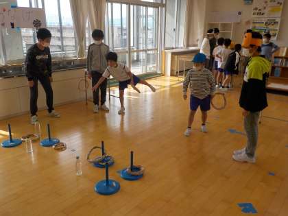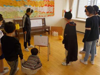 今日から白鳥っ子タイムにハロウィンパーティーが始まりました。白鳥っ子に楽しんでほしいと願う子供たちが自主的に準備を行い、輪投げやボーリング等でみんなを楽しませていました。