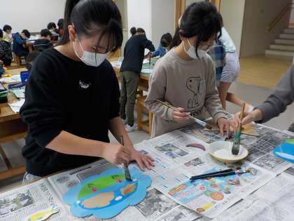 図画工作科では、糸のこを使ってホワイトボード伝言板を制作しています。仕上げにニスを塗っているところです。(1枚目)