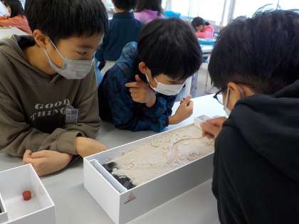 理科では、流れる水のはたらきの学習をしています。自分たちで川幅や水の量を考え、条件を1つずつ変えながら、実験を行いました。(3枚目)