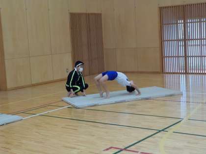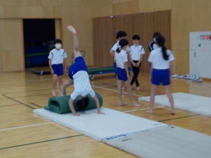 体育の時間にマット運動を行っています。動画を見て自分のフォームを確認したり、友達とポイントを教え合ったりしながら、一生懸命取り組んでいます。