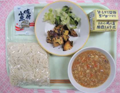 【献立】 ・ソフト麺 ・牛乳 ・肉味噌 ・大学芋 ・花野菜サラダ ・味付け小魚
