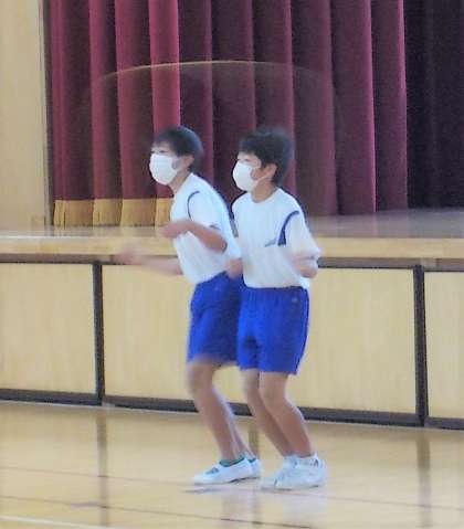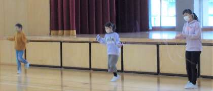 縄跳びの発表です。個人の技を披露したり、2人で二重跳びをしたりしていました。一人一人の頑張る姿に、白鳥っ子たちは大きな拍手を送っていました。