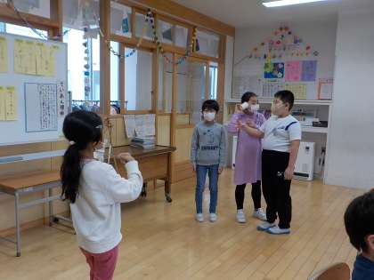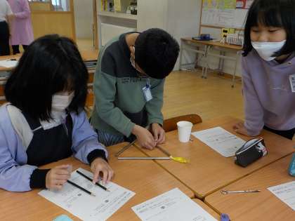 自分たちで道具を準備して調べました。班のみんなで協力して実験に取り組んでいます。