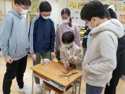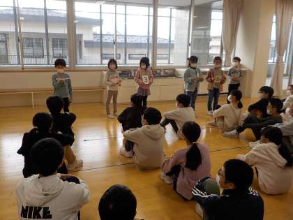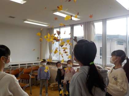 生活科「あきとあそぼう」の学習では、秋の木の実や落ち葉を使って、いろいろな遊びを考えました。今日は、6年生を招待して一緒に遊びました。