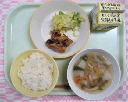 【献立】 ・ごはん ・牛乳 ・ポークパコラ ・ゆでキャベツ ・かぶのスープ
