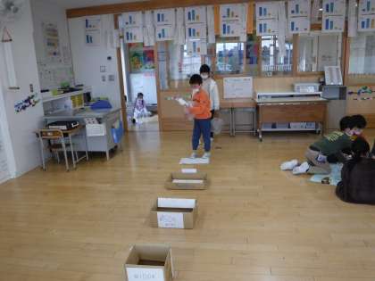 生活科の時間に作った動くおもちゃで遊びました。どのおもちゃも、高く跳ぶようにゴムの数を増やしたり、まっすぐ進むようにタイヤを調節したりと、パワーアップしていました。